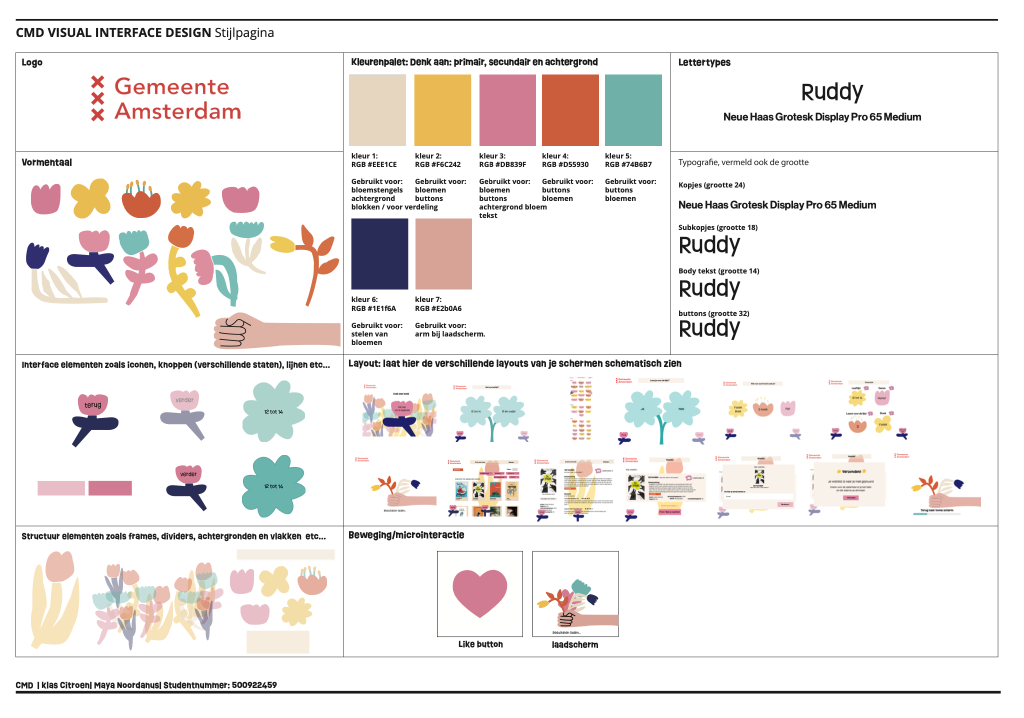 Hieronder staan mijn stijlpagina (1) en mijn moodboard (2) waarmee ik de app gedesignd heb. Mijn stijlblad (1) heb ik gemaakt aan de hand van mijn moodboard en mijn onderzoek van de huisstijl van de gemeente Amsterdam. Voor deze opdracht moest ik namelijk werken onder een huisstijl, die van de gemeente van Amsterdam. Tijdens de lessen hebben wij daar zelf een substijl voor mogen ontwerpen en daar een stijlblad van gemaakt. Vanuit mijn stijlblad (1) en moodboard (2) heb ik mijn uiteindelijke design van de app gemaakt waar ik erg tevreden mee ben. Ik wou het een vrolijke en toegankelijke sfeer geven voor de kinderen. Ook wou ik het aantrekkelijk maken en heb daarvoor de verschillende opvallende kleuren gebruikt.